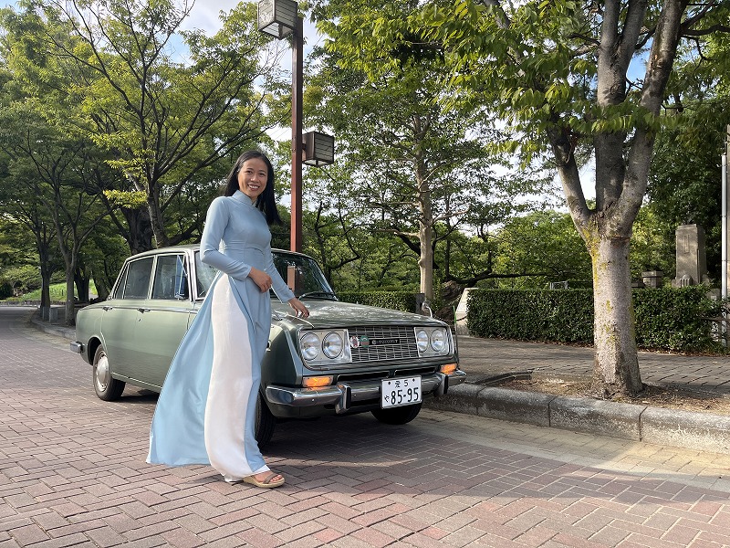 愛知県刈谷市の、郷土資料館前で撮影しました。 トヨタグループの元祖である「株式会社豊田自動織機」から徒歩で行けます。 女性の衣装は、ベトナムの伝統衣装であるアオザイです。